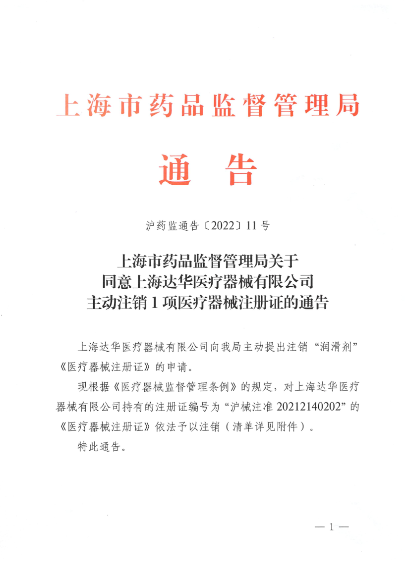 上海达华医疗器械有限公司向我局主动提出注销“润滑剂”《医疗器械注册证》的申请。