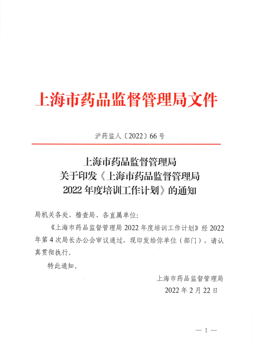 《上海市药品监督管理局2022年度培训工作计划》经2022年第4次局长办公会审议通过,现印发给你单位(部门),请认真贯彻执行。