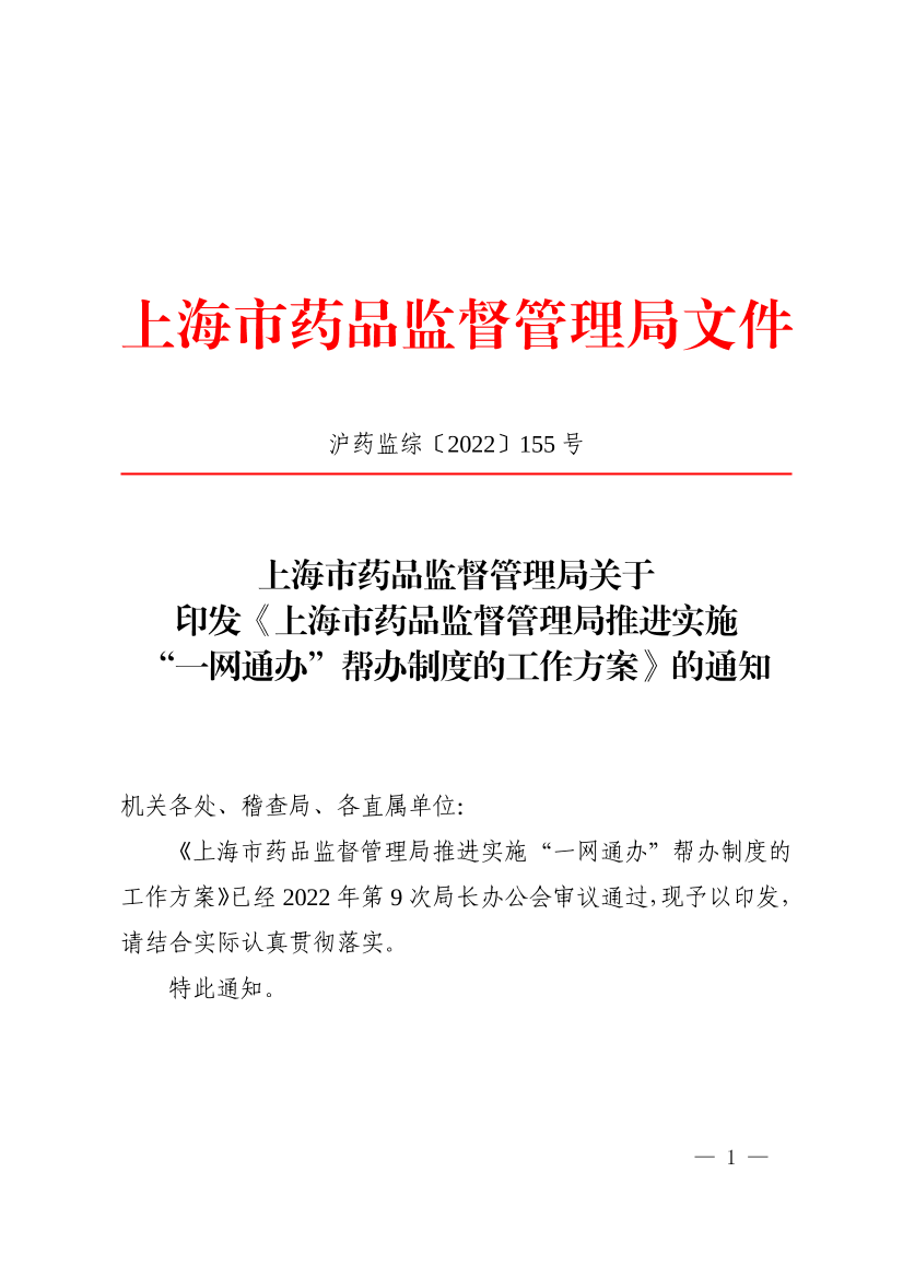 上海市药品监督管理局关于印发《上海市药品监督管理局推进实施“一网通办”帮办制度的工作方案》的通知