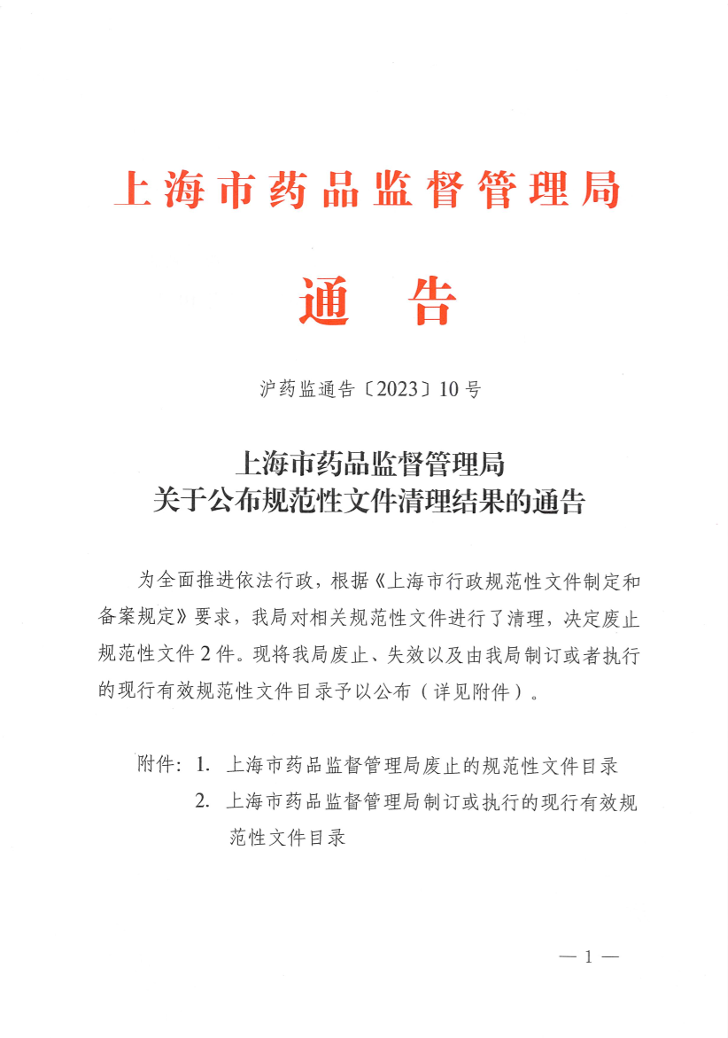 上海市药品监督管理局关于公布规范性文件清理结果的通告