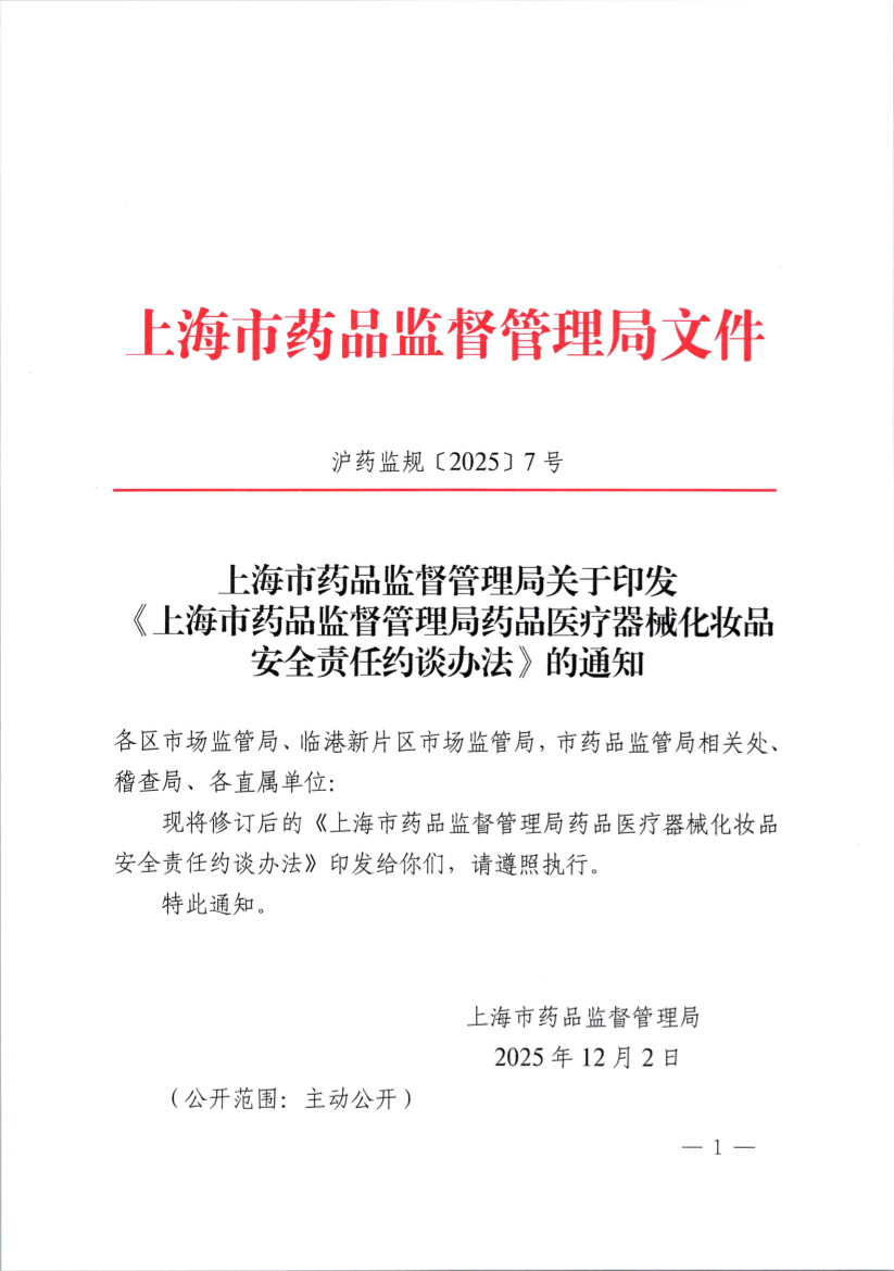 (有效期至2030年12月1日)上海市药品监督管理局关于印发《上海市药品监督管理局药品医疗器械化妆品安全责任约谈办法》的通知