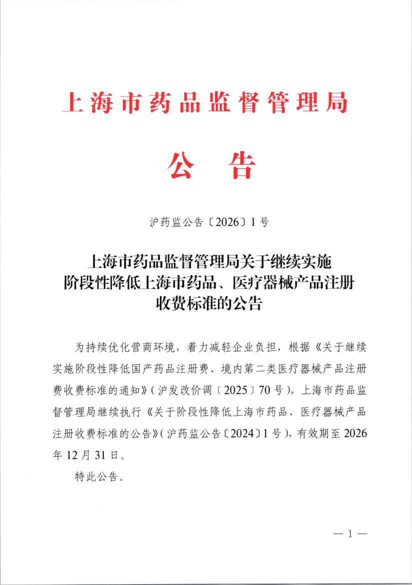 为持续优化营商环境,着力减轻企业负担,根据《关于继续实施阶段性降低国产药品注册费、境内第二类医疗器械产品注册费收费标准的通知》(沪发改价调﹝2025﹞70号),上海市药品监督管理局继续执行《关于阶段性降低上海市药品、医疗器械产品注册收费标准的公告》(沪药监公告〔2024〕1号),有效期至2026年12月31日。
