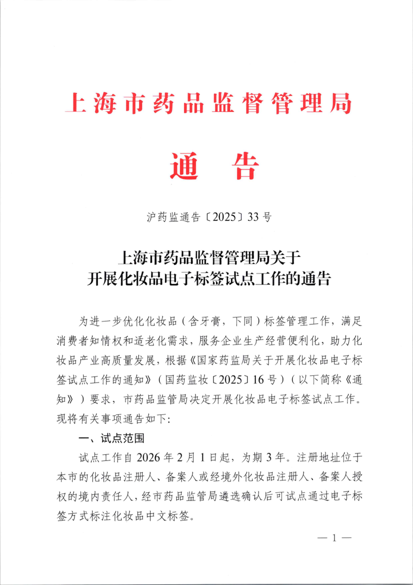 上海市药品监督管理局关于开展化妆品电子标签试点工作的通告