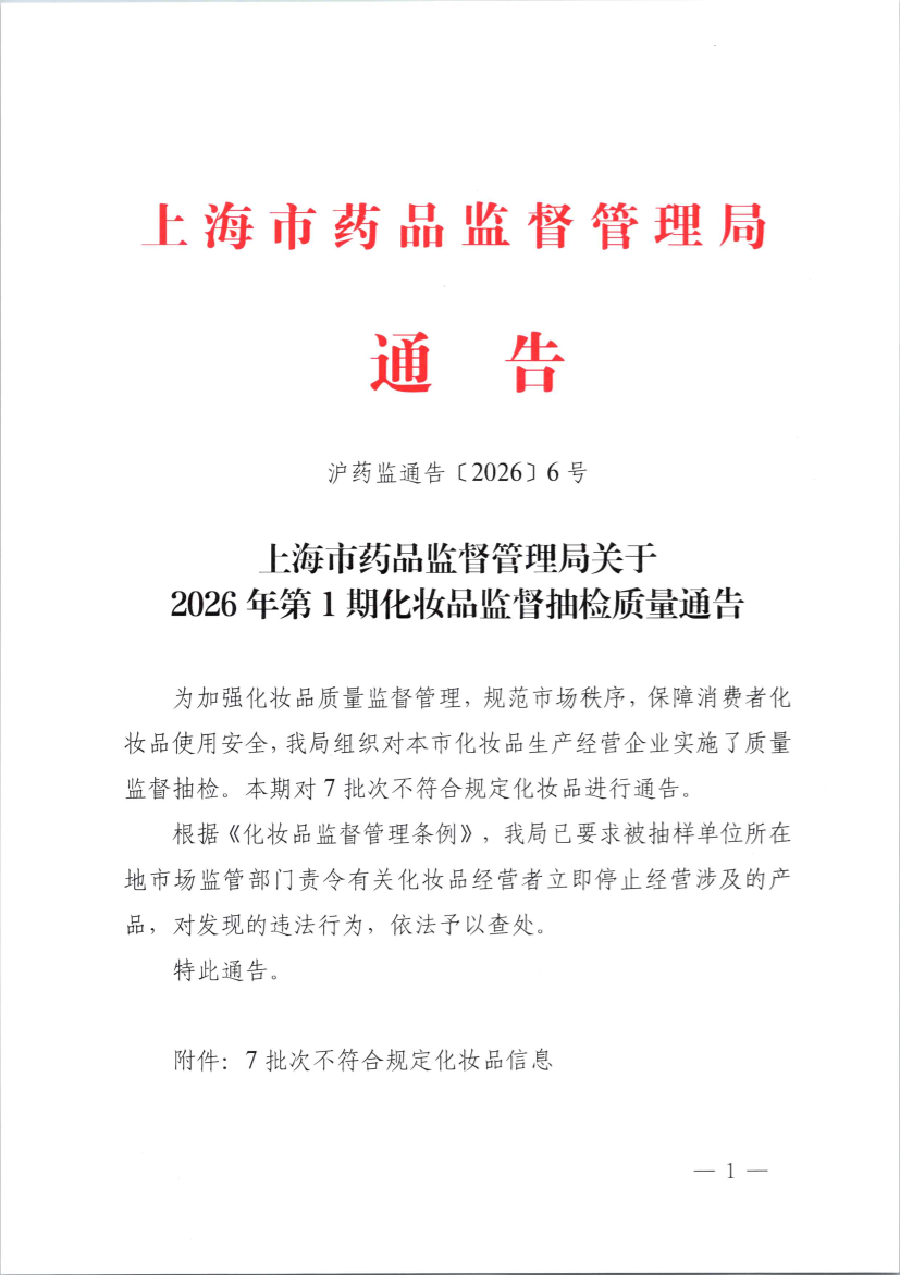 上海市药品监督管理局关于2026年第1期化妆品监督抽检质量通告