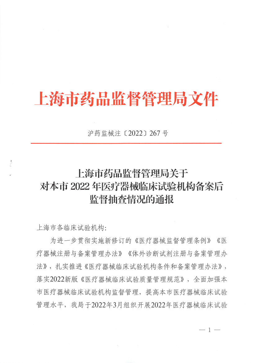 上海市药品监督管理局关于对本市2022年医疗器械临床试验机构备案后监督抽查情况的通报
