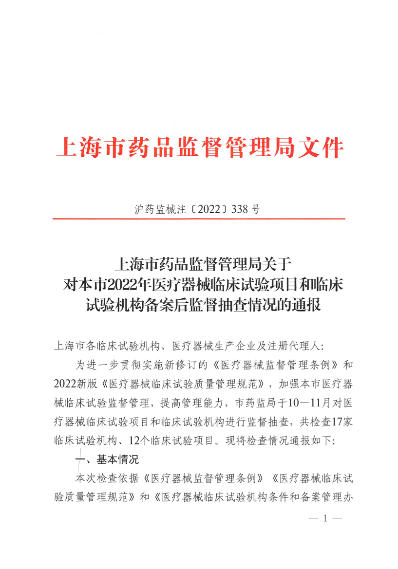 上海市药品监督管理局关于对本市2022年医疗器械临床试验项目和临床试验机构备案后监督抽查情况的通报