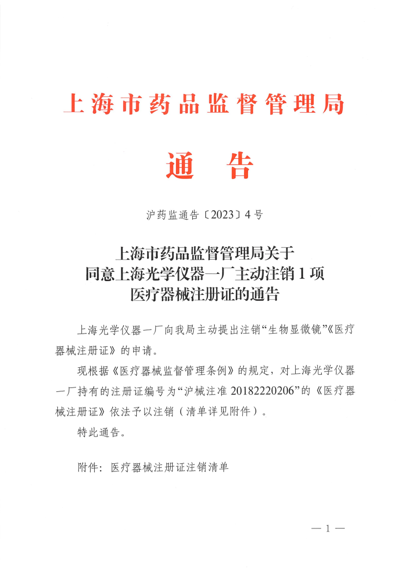 上海市药品监督管理局关于同意上海光学仪器一厂主动注销1项医疗器械注册证的通告