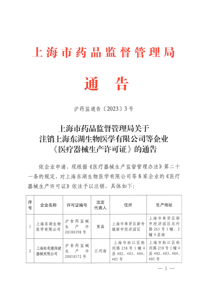 上海市药品监督管理局关于注销上海东湖生物医学有限公司等企业《医疗器械生产许可证》的通告