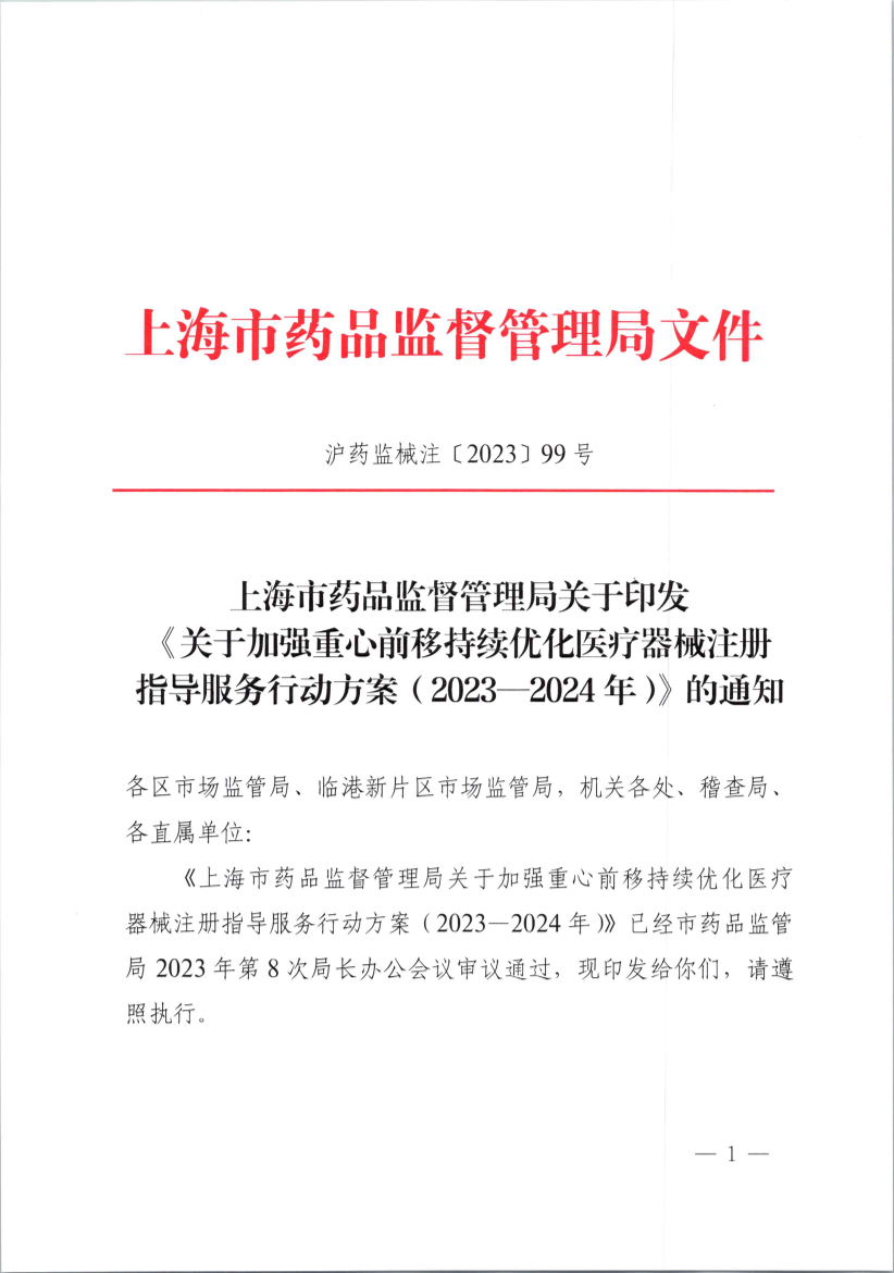 上海市药品监督管理局关于印发《关于加强重心前移持续优化医疗器械注册指导服务行动方案(2023—2024年)》的通知