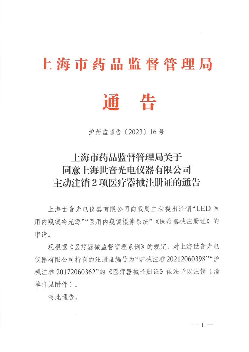 上海市药品监督管理局关于同意上海世音光电仪器有限公司主动注销2项医疗器械注册证的通告