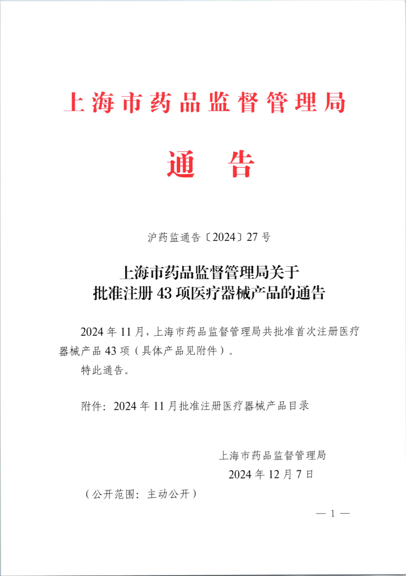 2024年11月,上海市药品监督管理局共批准首次注册医疗器械产品43项(具体产品见附件)。
