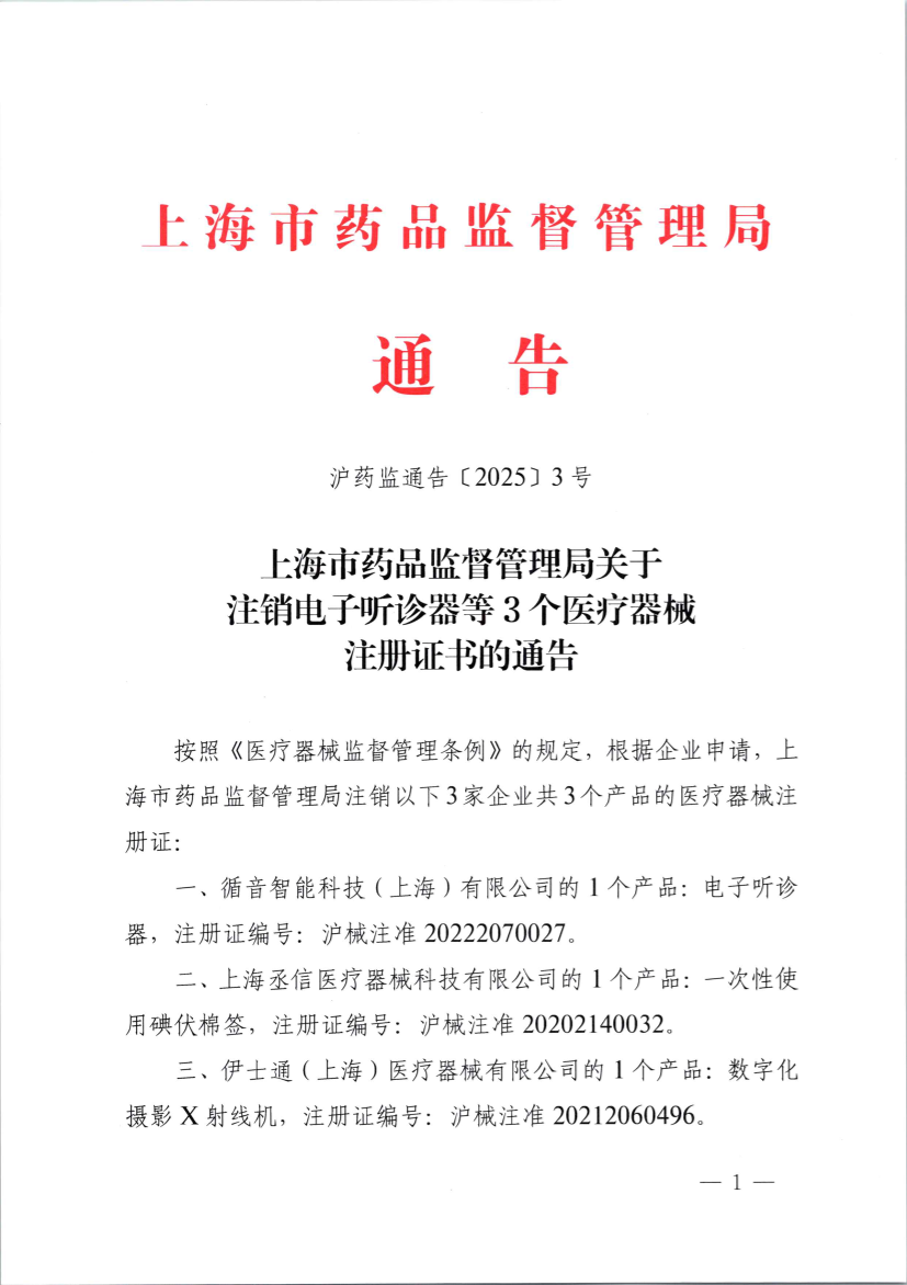 上海市药品监督管理局关于注销电子听诊器等3个医疗器械注册证书的通告
