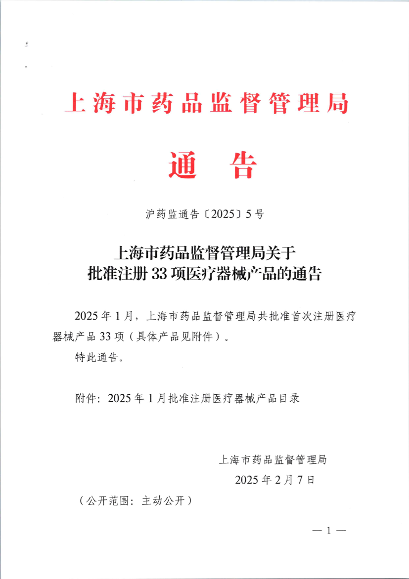 2025年1月,上海市药品监督管理局共批准首次注册医疗器械产品33项(具体产品见附件)。