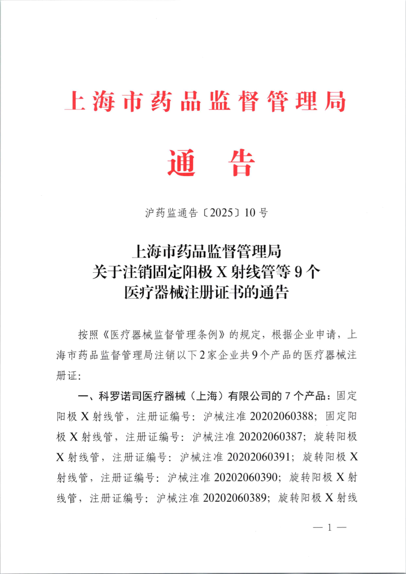 上海市药品监督管理局关于注销固定阳极X射线管等9个医疗器械注册证书的通告