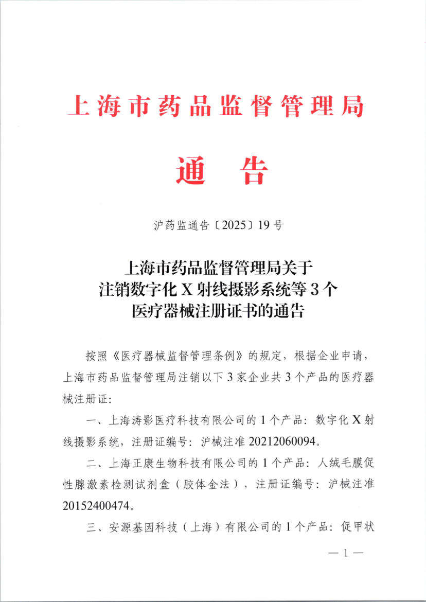 上海市药品监督管理局关于注销数字化X射线摄影系统等3个医疗器械注册证书的通告