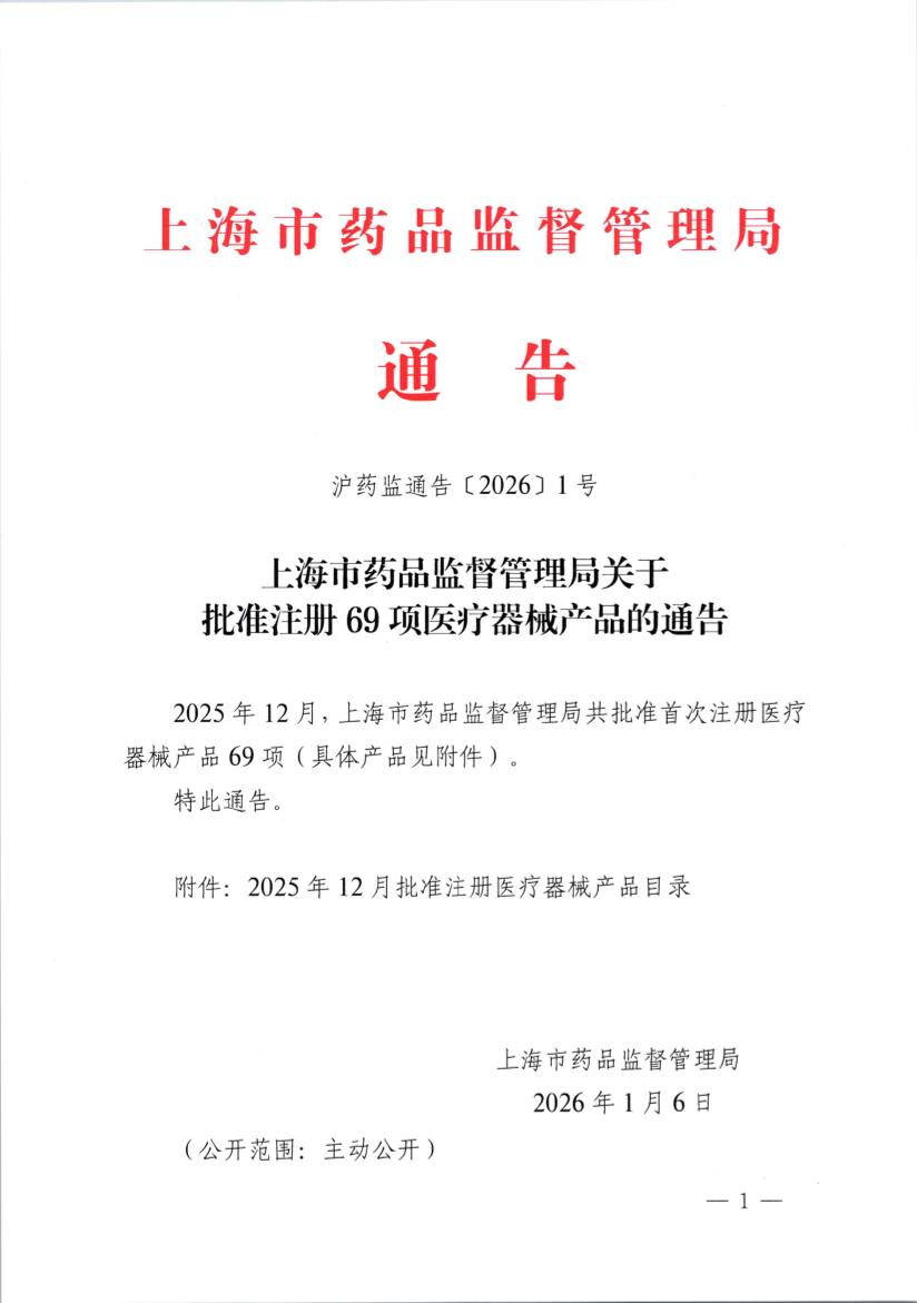 2025年12月,上海市药品监督管理局共批准首次注册医疗器械产品69项(具体产品见附件)。