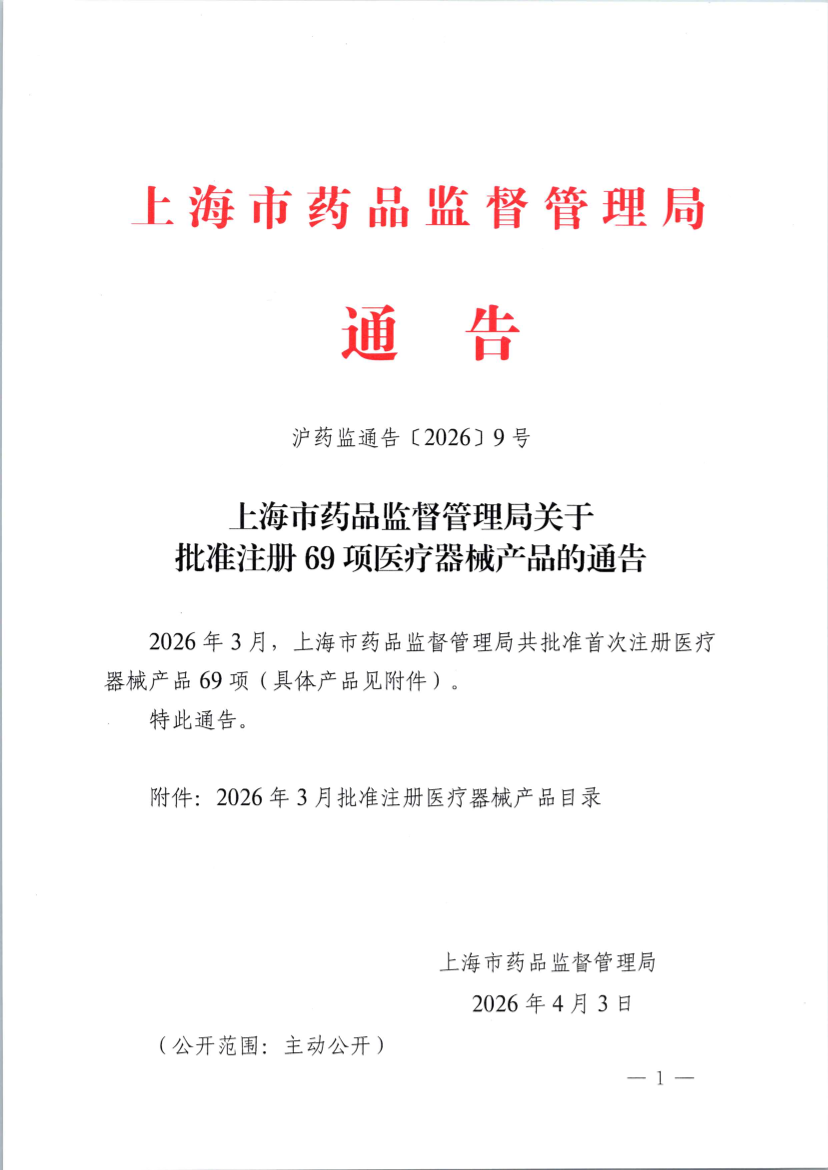 上海市药品监督管理局关于2026年3月批准注册医疗器械产品的通告