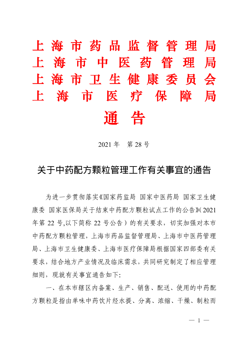 为进一步贯彻落实《国家药监局国家中医药局国家卫生健康委国家医保局关于结束中药配方颗粒试点工作的公告》(2021年第22号,以下简称22号公告)的有关要求,切实加强对本市中药配方颗粒管理,上海市药品监督管理局、上海市中医药管理局、上海市卫生健康委、上海市医疗保障局根据国家四部委有关要求,结合地方产业情况及临床需求,共同研究制定了相应管理细则,现就有关事宜通告如下: