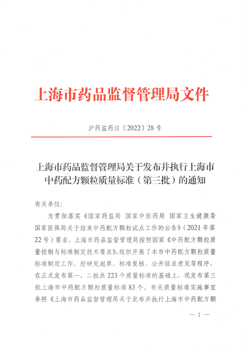 上海市药品监督管理局关于发布并执行上海市中药配方颗粒质量标准(第三批)的通知