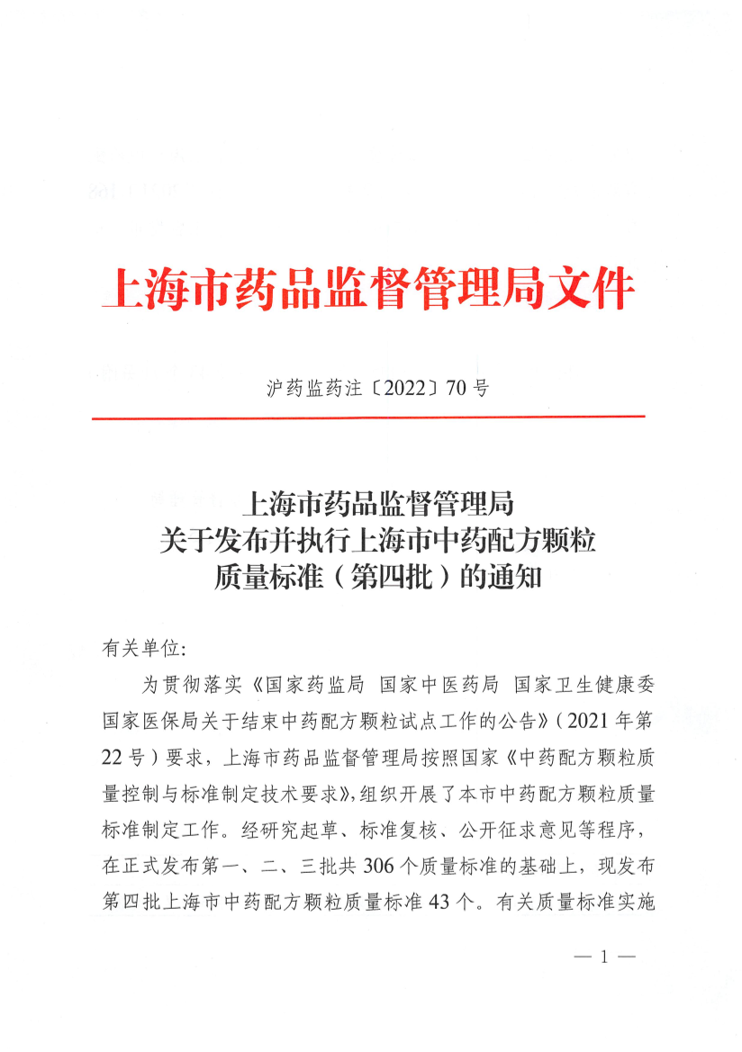 上海市药品监督管理局关于发布并执行上海市中药配方颗粒质量标准(第四批)的通知