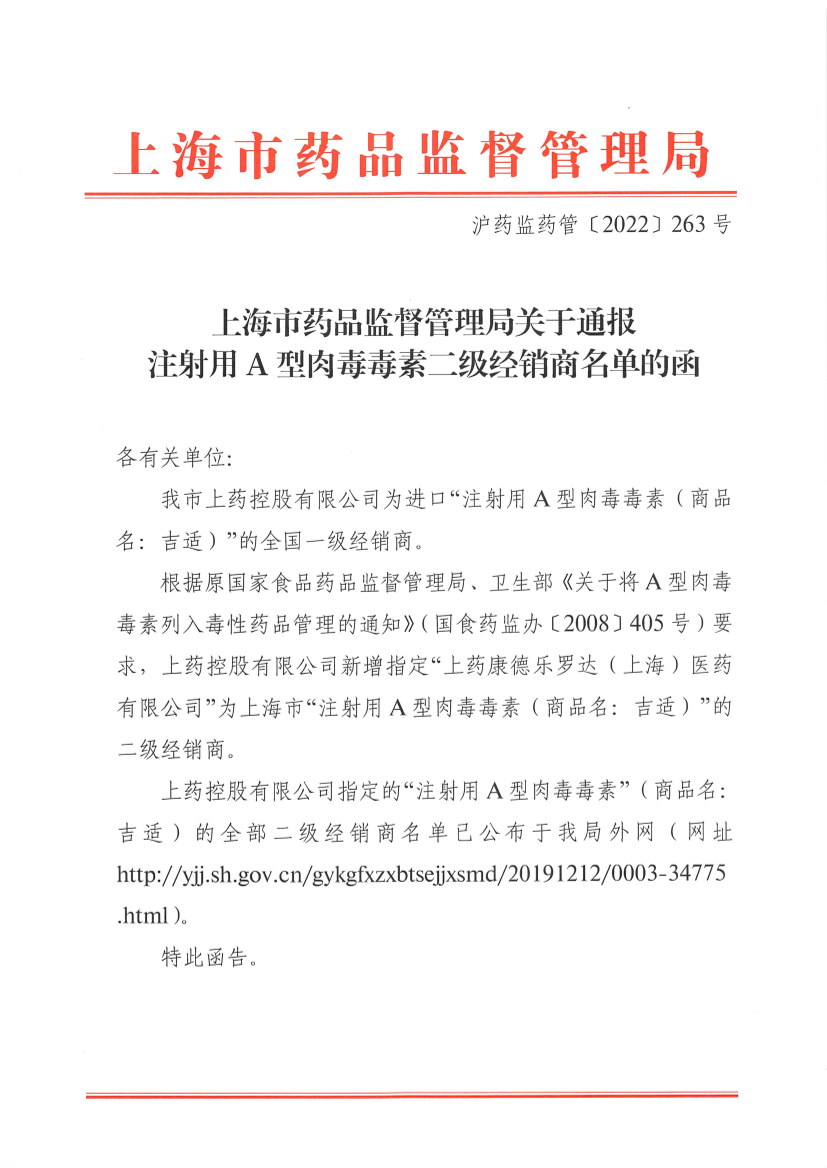 上药控股有限公司指定的“注射用A型肉毒毒素”(商品名:吉适)的全部二级经销商名单已公布于我局外网(网址http://yjj.sh.gov.cn/gykgfxzxbtsejjxsmd/20191212/0003-34775.html)。