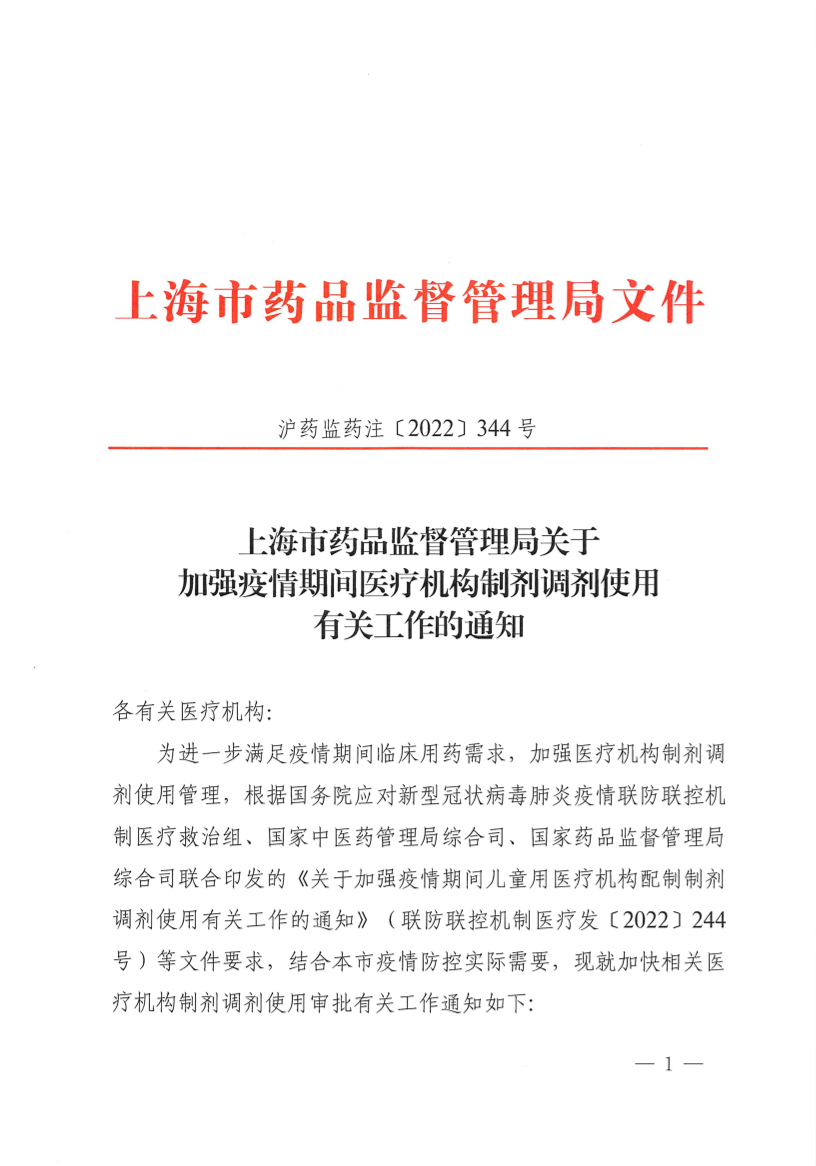为进一步满足疫情期间临床用药需求,加强医疗机构制剂调剂使用管理,根据国务院应对新型冠状病毒肺炎疫情联防联控机制医疗救治组、国家中医药管理局综合司、国家药品监督管理局综合司联合印发的《关于加强疫情期间儿童用医疗机构配制制剂调剂使用有关工作的通知》(联防联控机制医疗发〔2022〕244号)等文件要求,结合本市疫情防控实际需要,现就加快相关医疗机构制剂调剂使用审批有关工作通知如下: