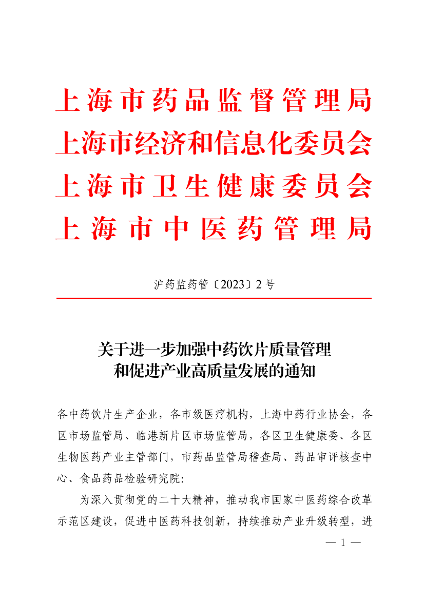 各中药饮片生产企业,各市级医疗机构,上海中药行业协会,各区市场监管局、临港新片区市场监管局,各区卫生健康委、各区生物医药产业主管部门,市药品监管局稽查局、药品审评核查中心、食品药品检验研究院: