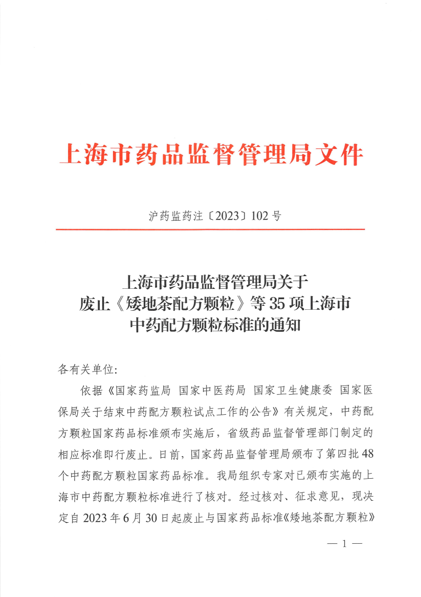 上海市药品监督管理局关于废止《矮地茶配方颗粒》等35项上海市中药配方颗粒标准的通知