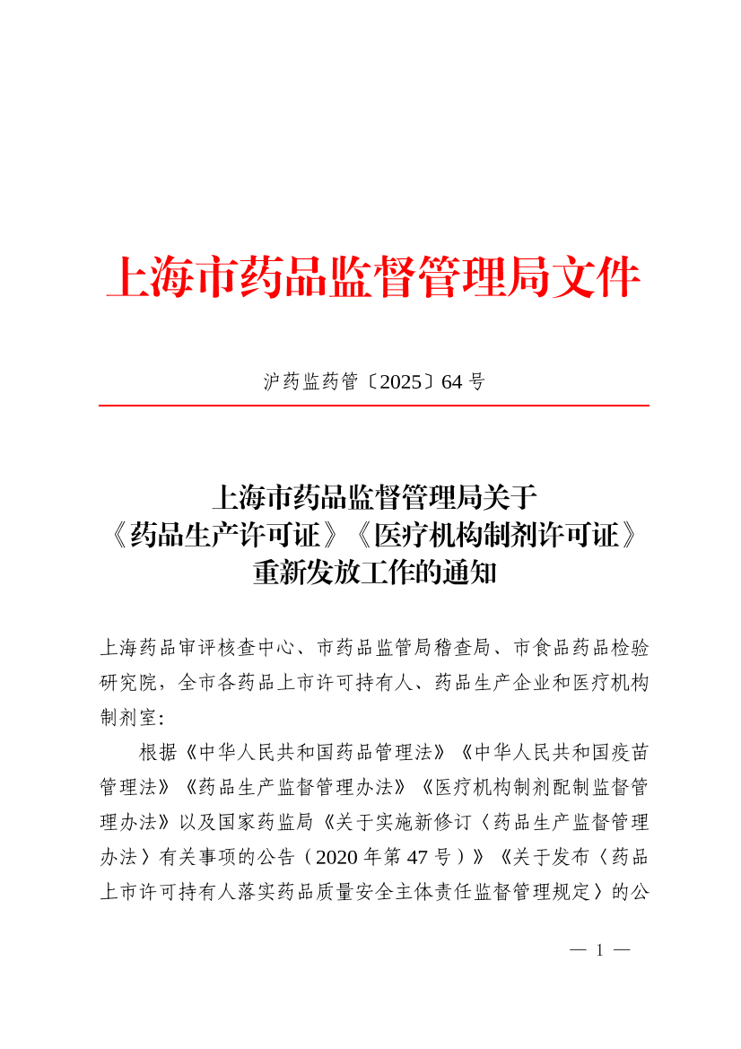 上海市药品监督管理局关于《药品生产许可证》《医疗机构制剂许可证》重新发放工作的通知