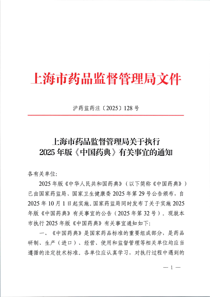 上海市药品监督管理局关于执行2025年版《中国药典》有关事宜的通知