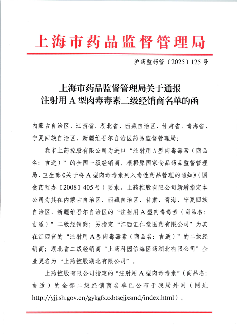 上海市药品监督管理局关于通报注射用A型肉毒毒素二级经销商名单的函