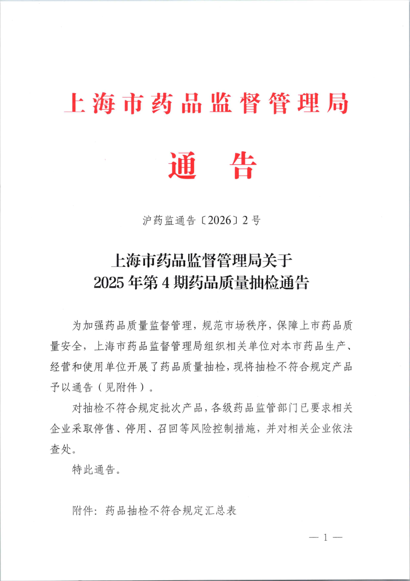 上海市药品监督管理局关于2025年第4期药品质量抽检通告