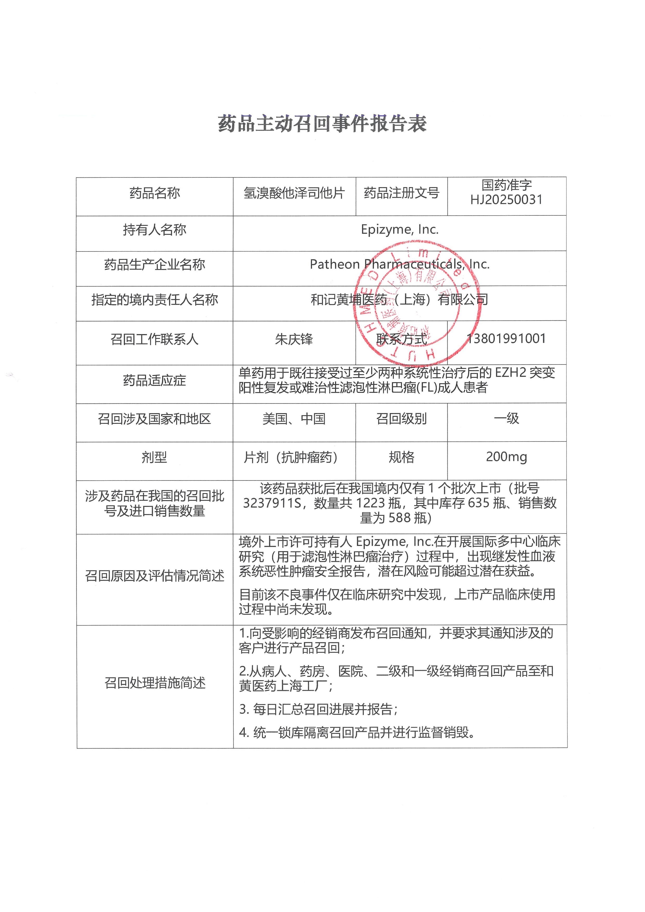Epizyme,Inc.与其境内责任人和记黄埔医药(上海)有限公司合作,已启动从中国市场立即召回本品的程序。