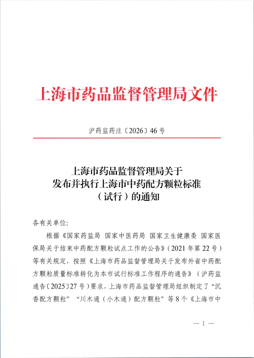 上海市药品监督管理局关于发布并执行上海市中药配方颗粒标准(试行)的通知